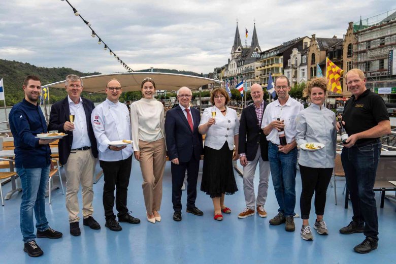 Boppards Bürgermeister Jörg Haseneier begrüßte die Gäste an Bord des Schiffes: „Dass diese Schwimmende Weinprobe nicht nur bei der Premiere im vergangenen Jahr, sondern auch bei ihrer Fortsetzung heute auf so großen Zuspruch stößt, freut mich persönlich sehr. Alle Beteiligten haben im Vorfeld wirklich Vieles in Bewegung gesetzt, damit wir heute einen sicherlich unvergesslichen Abend erleben dürfen.“ Die Gäste erwartete eine moderierte Wein- und Sektprobe aus dem Bopparder Hamm. Dazu servierten ausgewählte Spitzengastronomen aus der Region kulinarische Köstlichkeiten.