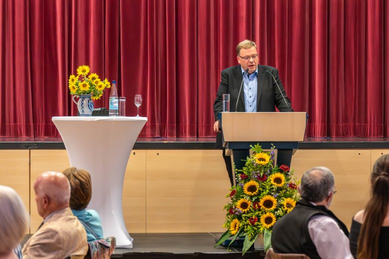 Landrat Volker Boch ging in seiner Ansprache auf das Thema Flucht ein: „Menschen sind vor 200 Jahren aus unserer Region geflohen aus wirtschaftlichen Gründen und größter Not, um sich an einem anderen Platz ein neues Leben aufzubauen“, sagte Volker Boch und betonte, das Thema Flucht sei heute weltweit aktueller denn je. Er warb in diesem Zuge auch für den Besuch der neuen Ausstellung im Bopparder Museum „Hunsrück – Weggehen und Ankommen“, die sich bis zum 22. Dezember 2024 dem Thema Flucht aus diesen beiden Perspektiven nähert – dem Blick auf damals und heute.
